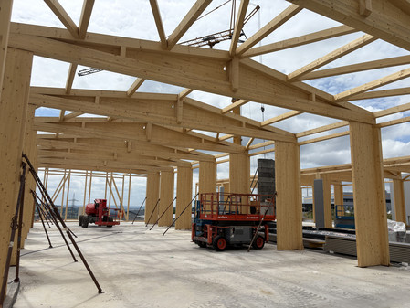 Ja, es gibt aktuelle Projekte, die aus meiner Sicht wirklich zukunftsfähig gebaut wurden – und einige davon durften wir selbst begleiten. Das bekannteste Beispiel ist sicher die Produktionshalle der CLTECH, an der wir beteiligt waren. Dort wurde Eichenholz aus dem Forst Trier als Druckstäbe für einen 35 m langen Fachwerkträger eingesetzt. Besonders spannend: Dieses Laubholz war ursprünglich als Brennholz vorgesehen – und wurde stattdessen zu einem hochleistungsfähigen Bauteil im Ingenieurholzbau. Ein perfektes Beispiel dafür, wie wertvoll und leistungsfähig Laubholz und Materialien geringerer Sortierqualitäten sein können, wenn man konstruktiv richtig damit umgeht.