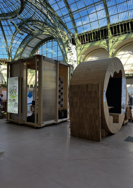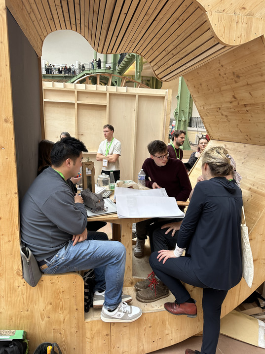 Weiterhin war die Masterarbeit der Studierenden Svenja Brehm, mittlerweile wissenschaftliche Mitarbeiterin am Lehrstuhl von Prof. Dirk Bayer (RPTU) ausgestellt, die sogenannte „Kirchenbox“: ein Holzeinbau, der zerstörungsfrei auf- und abbaubar, flexibel montierbar und natürlich aus Holz für große Räume mit einer kleineren, temporären Nutzung (wie bspw. in Kirchen) konstruiert wurde. Das Bistum Mainz hatte das Exponat freundlicherweise für den Stand ausgeliehen, und war mit zwei Vertretern nach Paris gereist.