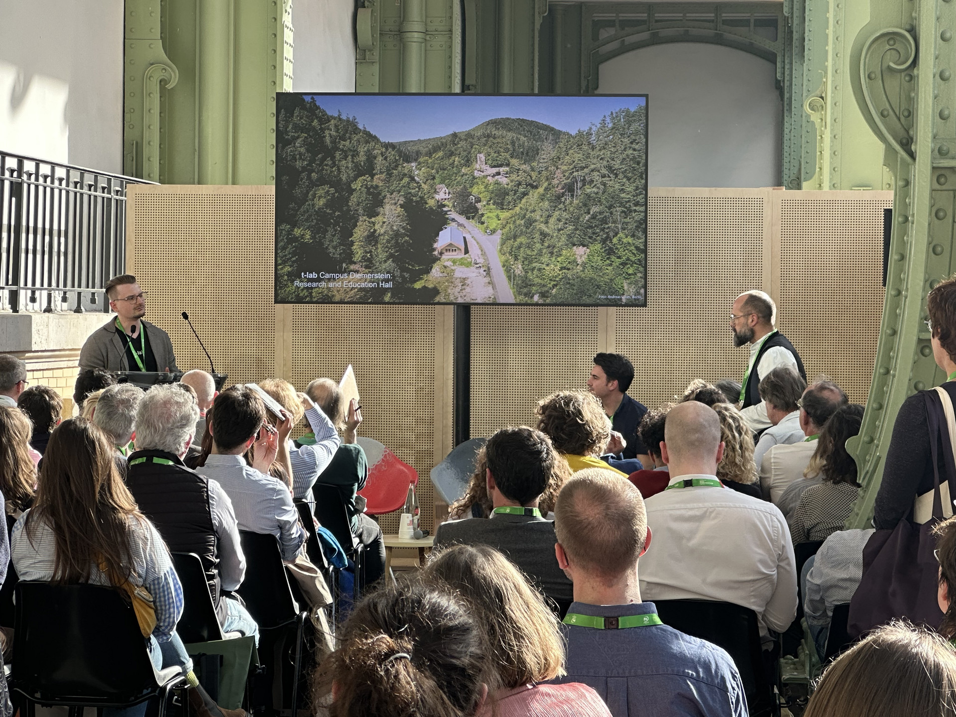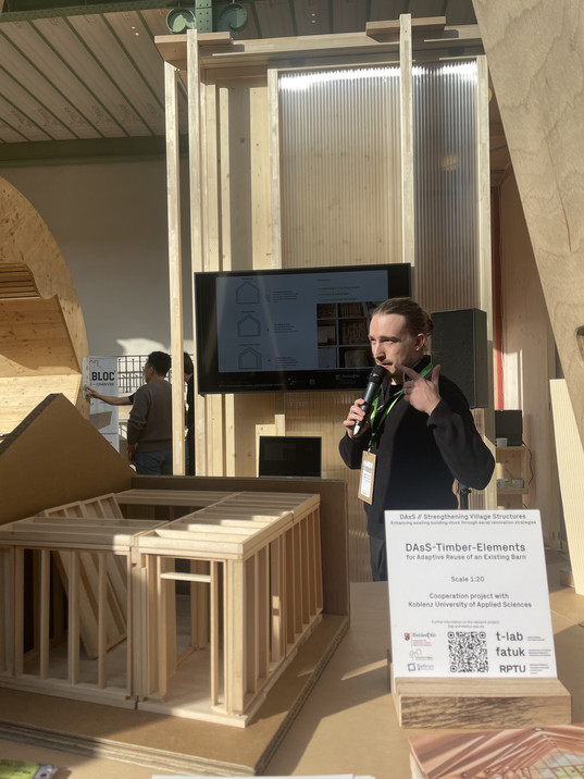 Weitere Exponate der Werk- und Forschungshalle Diemerstein, wie der Konusadapter und der Knoten aus Kunstharzpressholz (KP) für diesen zirkulär konstruierten Holzbau wurden auf der speziell entwickelten Werkbank des t-lab gezeigt, und wurden von vielen Besuchern intensiv begutachtet. Diese Handexponate ergänzten sich gut mit dem Beitrag des t-labs im offiziellen Programm der Veranstalter am Donnerstagnachmittag, ein Vortrag über die Leitlinien des Lehrstuhls, unter der Leitung von Prof. Dr.-Ing. Jürgen Graf, der ausschließlich rückbaubare Konstruktionen verwendet und entwickelt. Prof. Dirk Bayer stellte das Team und die Arbeit in dem Vortrag vor und verwies auf die im Jahr 2025 erschienene Publikation „Wege zur Bauwende“ („Construire l´avenir“), die die notwendige Wende im Bauwesen von mehreren Seiten wissenschaftlich analysiert.
