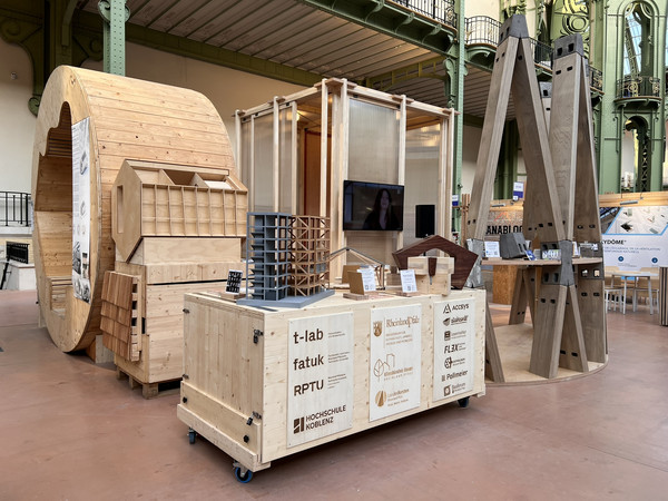 Der Stand war mit 36m² und knapp zwanzig betreuenden Personen (Studierende, wissenschaftliche Mitarbeitende und Professoren rheinland-pfälzischer Universitäten und Hochschulen) ein Anlaufpunkt für interessierte Besucher. Die Präsentation des 1:2 „Pfalzturm-Mock-Ups“ schaffte durch seine gebogene Form eine Art Innenraum, der sich zu den weiteren Exponaten hin öffnete. Mit den 3D-gedruckten Edelstahlknoten (Kooperationsprojekt mit der Hochschule für Technik, Wirtschaft und Kultur (HTWK) Laserinstitut Leipzig) zeigte das t-lab der RPTU erstmals das hochfeste Material „acetyliertes Buchen LVL“ (Herstellung durch die Firma Dehonit). Durch den Prozess der chemischen Modifikation -Acetylierung- von heimischen Buchenfurnieren (Fa. Accsys, NL) wird das Schwind- und Quellverhalten um ca. 80% reduziert und die höchste Dauerhaftigkeit gegenüber holzschädigenden Organismen erreicht (DCL 1). Damit eignet es sich für bewitterte Tragwerke, wie Türme, Brücken, etc.