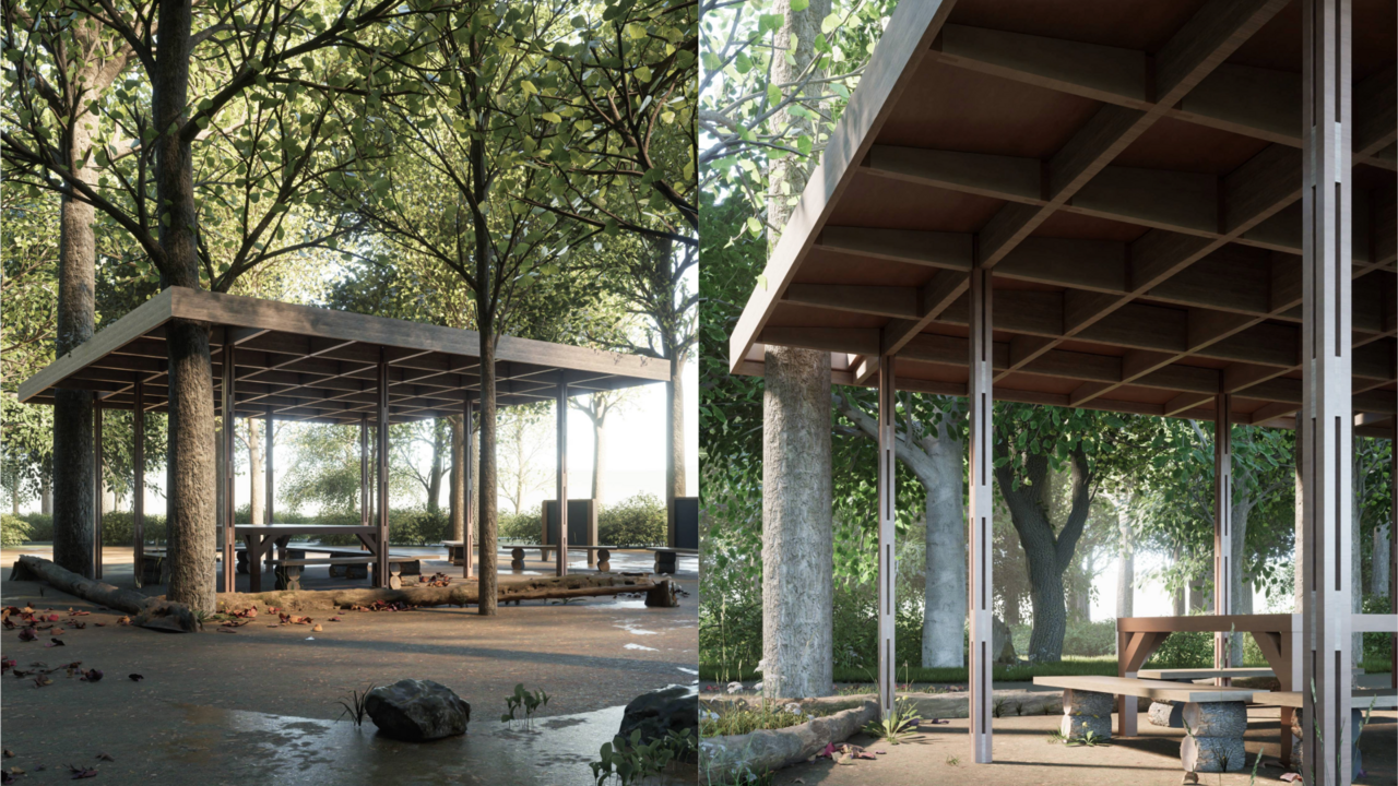 Der Gewinnerentwurf besteht aus einer Kassettendecke, die besonders wirksam beim Überspannen quadratischer Grundflächen ist. Die Besonderheit des Entwurfes besteht darin, dass das Dach nicht einfach auf der freien Fläche geplant wurde, sondern sich effektiv mit dem Wald verbindet. Durch ein Aufmaß war es möglich, die genauen Positionen der Bäume zu bestimmen und somit das Dach so zu platzieren, dass zwei der Bäume durch das Dach hindurchlaufen.