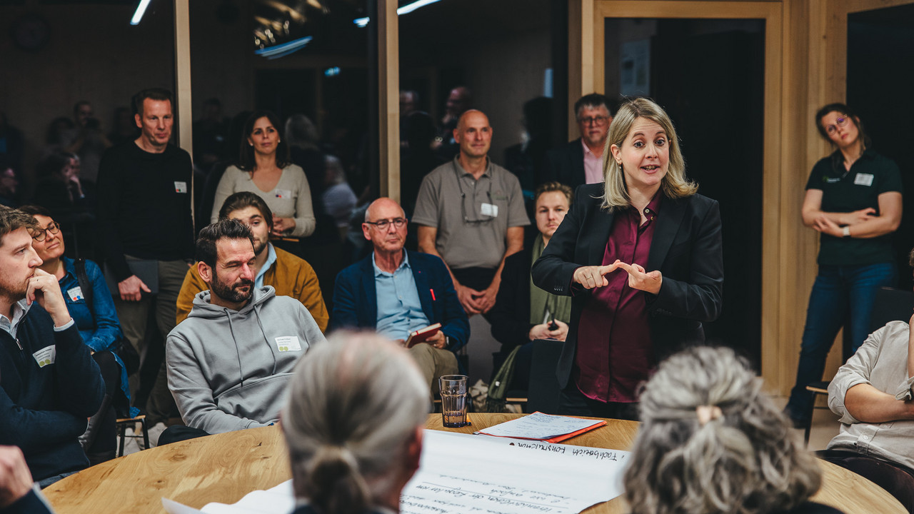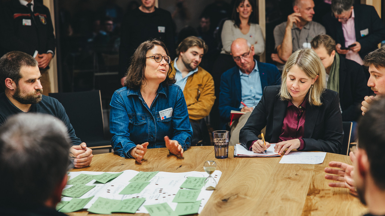 Bei der Veranstaltung am 30. Oktober präsentierten „das Klimabündnis“ und seine Gäste kein Forderungspapier, sondern diskutierte gemeinsam am Runden Tisch über die erarbeiteten Lösungsansätze von fünf interdisziplinär gemischten Fachgruppen aus Forst, Säge und Handel, Architekten, Fachplanern und Holzbauern der Region.